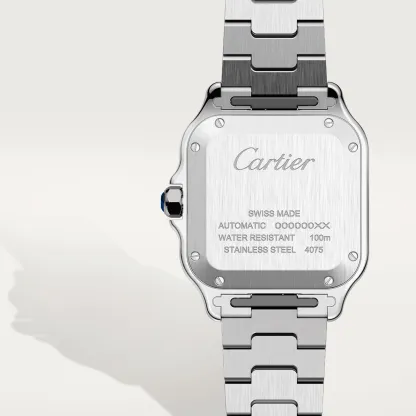 Santos watch, medium model, Manufacture mechanical movement with automatic winding, caliber 1847 MC. Steel case, 7-sided crown set with a faceted synthetic spinel, silvered opaline dial, steel sword-shaped hands, sapphire crystal. Steel bracelet with “SmartLink” adjustment system. Second bracelet in calfskin, with interchangeable steel folding buckle. Both bracelets are fitted with the “QuickSwitch” interchangeability system. Case width: 35.1 mm, thickness: 8.83 mm. Water-resistant up to 10 bar (approx. 100 meters/100 feet).