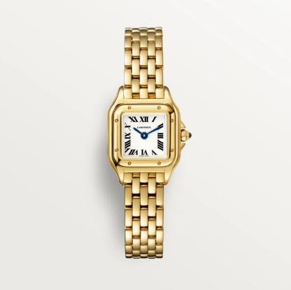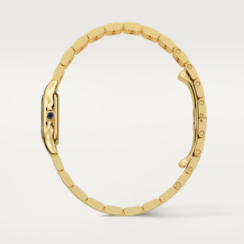 Panthère de Cartier watch, mini model, quartz movement. 18K yellow gold case and bracelet. 18K yellow gold octagonal crown set with a sapphire cabochon. Silver dial, blued-steel sword-shaped hands, sapphire crystal. Case dimensions: 25 mm x 21 mm, thickness: 6 mm. Water-resistant up to 3 bar (approx. 30 meters/100 feet)