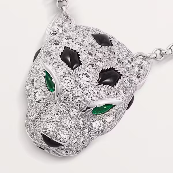 Panthère de Cartier necklace, 750‰ white gold, onyx, set with 2 emeralds and 135 brilliant-cut diamonds totaling 1.14 carats.