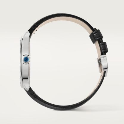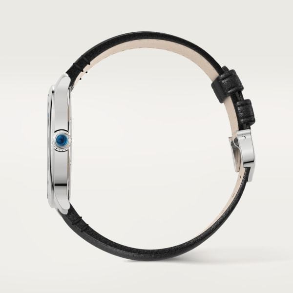 Ronde Must de Cartier watch, 36 mm, high autonomy quartz movement (approx. 8 years). Steel case, beaded crown set with a synthetic cabochon-shaped spinel, sandblasted silvered dial, blued-steel sword-shaped hands, sapphire crystal, black strap (made without animal materials), steel ardillon buckle. Thickness: 7.89 mm. Water-resistant to 3 bar (approx. 30 metres).